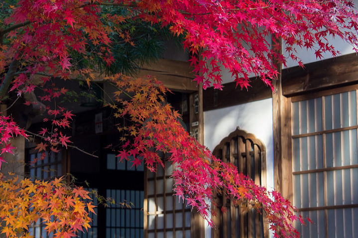 覚園寺の紅葉が夕陽で一段と輝きました。